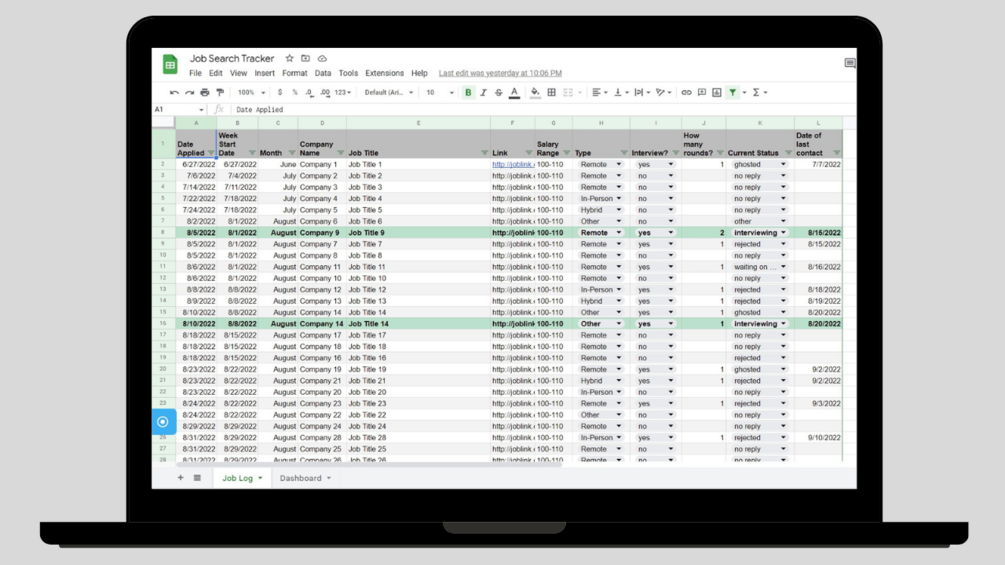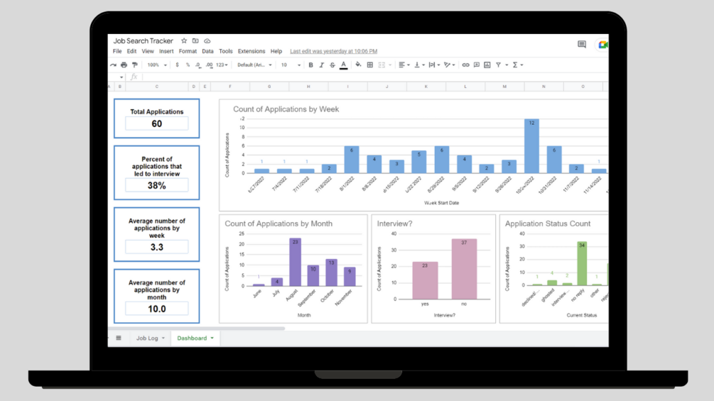 Keep track of your job search with a tracker. Included in the spreadsheet is a Job Log where you can list every job you apply for and update the status as you move through interviews. Additionally, there is a Dashboard tab that displays data and visualizations related to your job search.